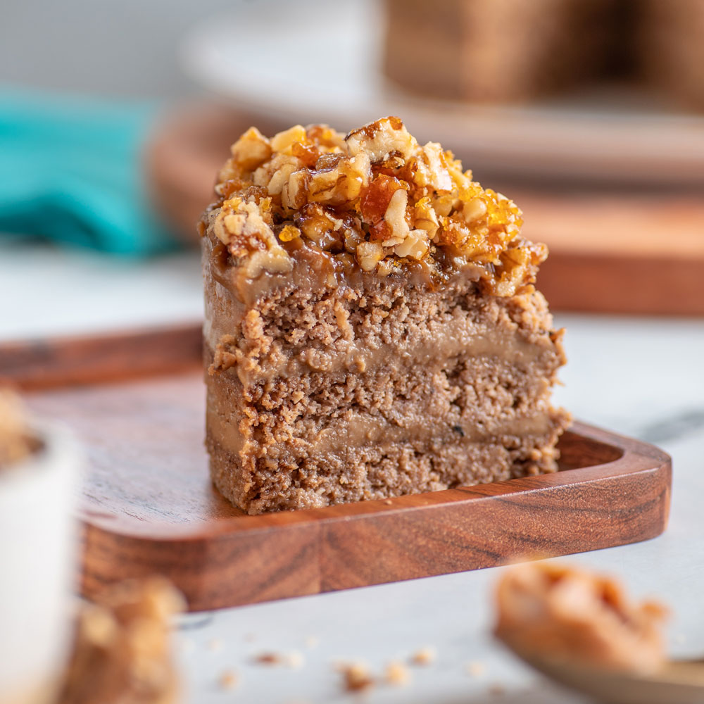 Una creación artesanal que combina el sabor clásico del manjar con el toque crocante del praliné de nuez. Su bizcocho húmedo y esponjoso está elaborado con harinas de frutos secos.